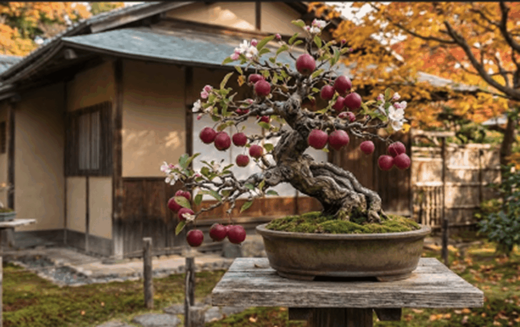 姫りんご盆栽は、春の可憐な花と秋の愛らしい実——一年で二度の楽しみを味わえる”実もの盆栽”の代表格です。